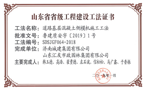集团“道路基层混凝土侧模机施工工法”被评为山东省省级工程建设工法