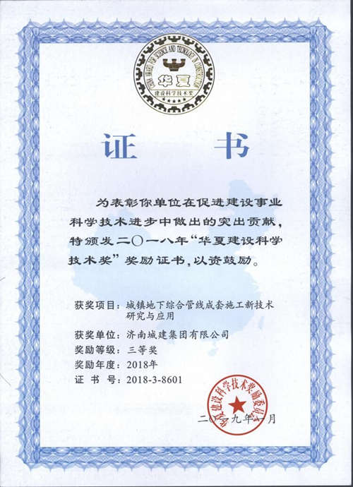 集团《城镇地下综合管线成套施工新技术研究与应用》荣获华夏建设科学技术奖三等奖