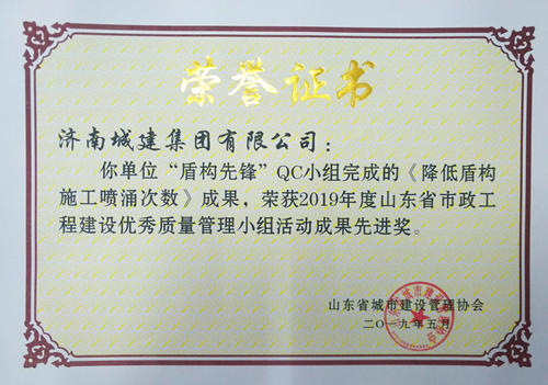 集团“盾构先锋”QC小组完成的《降低盾构施工喷涌次数》成果荣获“2019年度山东省市政工程建设优秀质量管理小组活动成果先进奖
