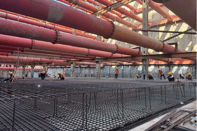 质量管控方面,项目部实行全过程精细化管理。钢筋工程严格执行图纸要求,对型号、间距、搭接等关键参数逐一验收;混凝土浇筑采用串筒工艺保障浇筑质量,技术人员全程旁站监督,定时检测坍落度指标。振捣作业遵循标准化流程,对关键部位加强振捣力度。混凝土初凝前实施二次抹压工艺,有效提升结构自防水能力。经过70个昼夜的连续施工,项目部高质量完成全部23节底板的封底任务。