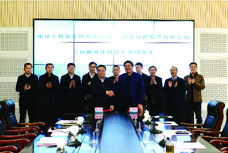 1月4日下午,集团与中铁十四局集团举行战略合作签约仪式。济南城市建设集团副总经理许为民、集团总经理牟晓岩,中铁十四局集团总经理周长进等参加签约仪式。
