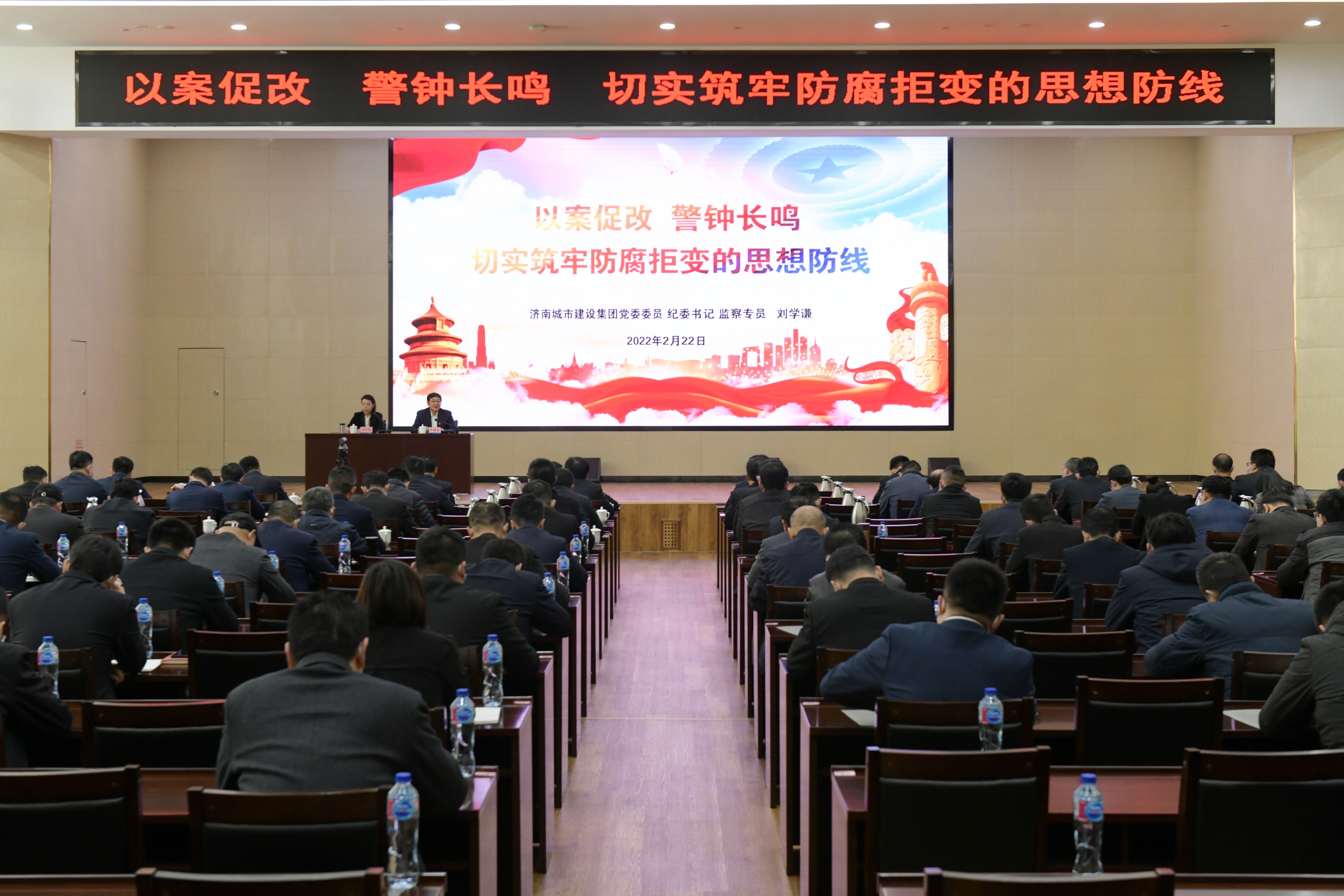 刘学谦同志以“以案促改,警钟长鸣,切实筑牢防腐拒变的思想防线”为题讲党课。首先,对十九届中央纪委六次全会及省市纪委十一届七次全会精神进行了传达。她强调,一是党的十八大以来,全面从严治党取得了历史性、开创性成就,产生了全方位、深层次影响,必须长期坚持、不断前进;二是持续惩治国有企业腐败问题,强化廉洁风险防控,坚决查处基础设施建设等方面腐败问题。三是持之以恒精准纠治“四风”,加快构建常态化体制机制,巩固国企反腐败成果。四是通过对建设系统违纪违法典型案件进行深度剖析,以案示警、以案促治,提出加强全面从严治党的新要求。她指出,国有企业党员干部要算好“政治账、经济账、家庭账、名誉账、自由账”用实际行动铸就防腐拒变坚固防线。城建集团要扛实抓细主体责任、监督责任和一岗双责,毫不动摇加强党的领导;增强政治意识,扛起从严管党治党政治责任;坚决保持定力,持之以恒加强作风建设;坚守廉洁底线,确保畅享健康幸福人生;坚持严管厚爱,切实保护干部工作积极性,不断推动党风廉政建设和反腐败工作走向深入。牟晓岩同志在主持讲话中表示,刘学谦同志党课站位高远、脉络清晰、案例典型、令人警醒,具有极强的思想性、前瞻性和指导性。他要求,集团全体党员干部要强化政治引领,保持正确政治航向,坚决执行集团各项决策部署,做到令行禁止、政令畅通,形成思想同心、目标同向、行动同步的良好局面;聚焦高质量发展,勇于担当争先进位,加快推进集团“十四五”规划实施,推动集团各项工作再上新台阶;永葆廉洁本色,强化纪律作风保障,压紧压实“两个责任”,践行“严真细实快”工作作风,持续推进“三不一体”工作机制,切实为集团高质量发展营造良好政治生态,为推进城市建设事业和“强省会”建设贡献更大力量,以优异成绩迎接党的二十大胜利召开!